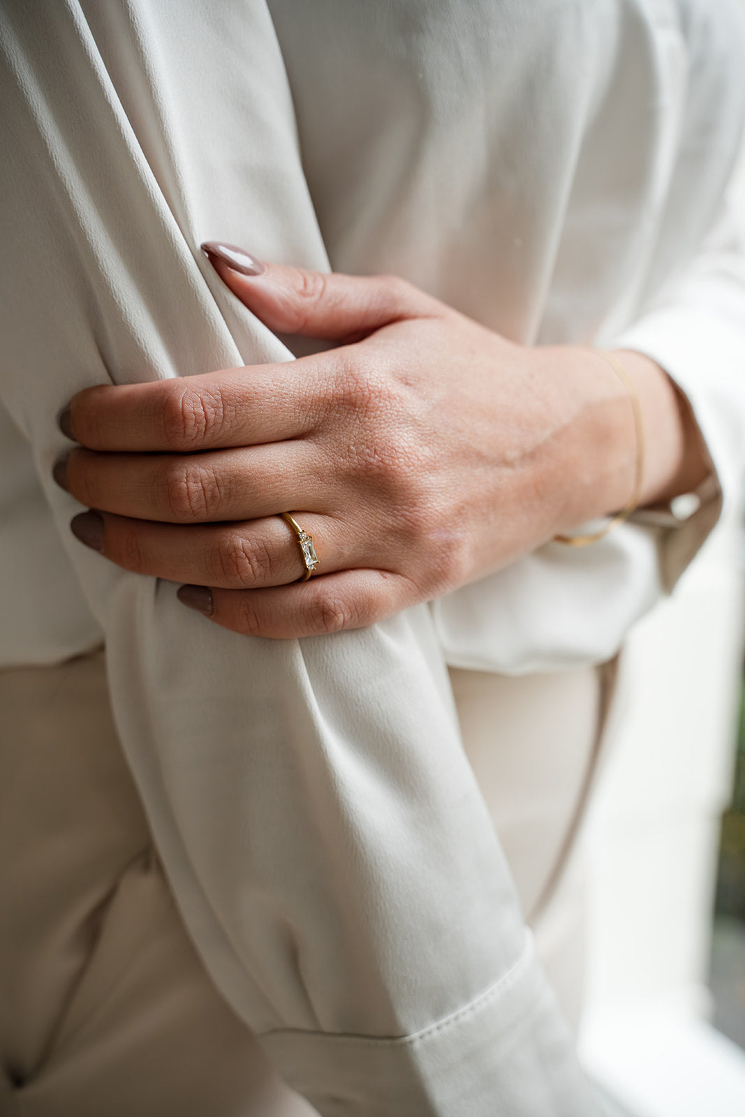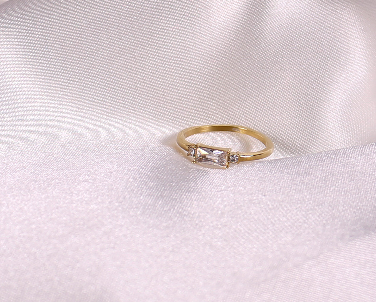 Deze prachtige ring heeft een rechthoekige steen met aan beide kanten een kleine ronde steen. De band van de ring heeft een gladde structuur dat zorgt, wat deze ring een echte klassieker maakt. De ring is gemaakt van stainless steel, verguld met een laagje 18K gold plated, waardoor de ring niet verkleurt.
