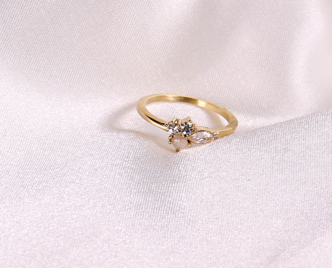 Deze klassieke Keymi ring heeft een verfijnde smalle band met 4 verschillende formaten stenen in beige tinten. Één steen is glasachtig gekleurd, de andere drie stenen zijn gemaakt van zirkonia. Leuk om te dragen bij elke gelegenheid. De ring is gemaakt van stainless steel en is verguld met 18-karaats goud.