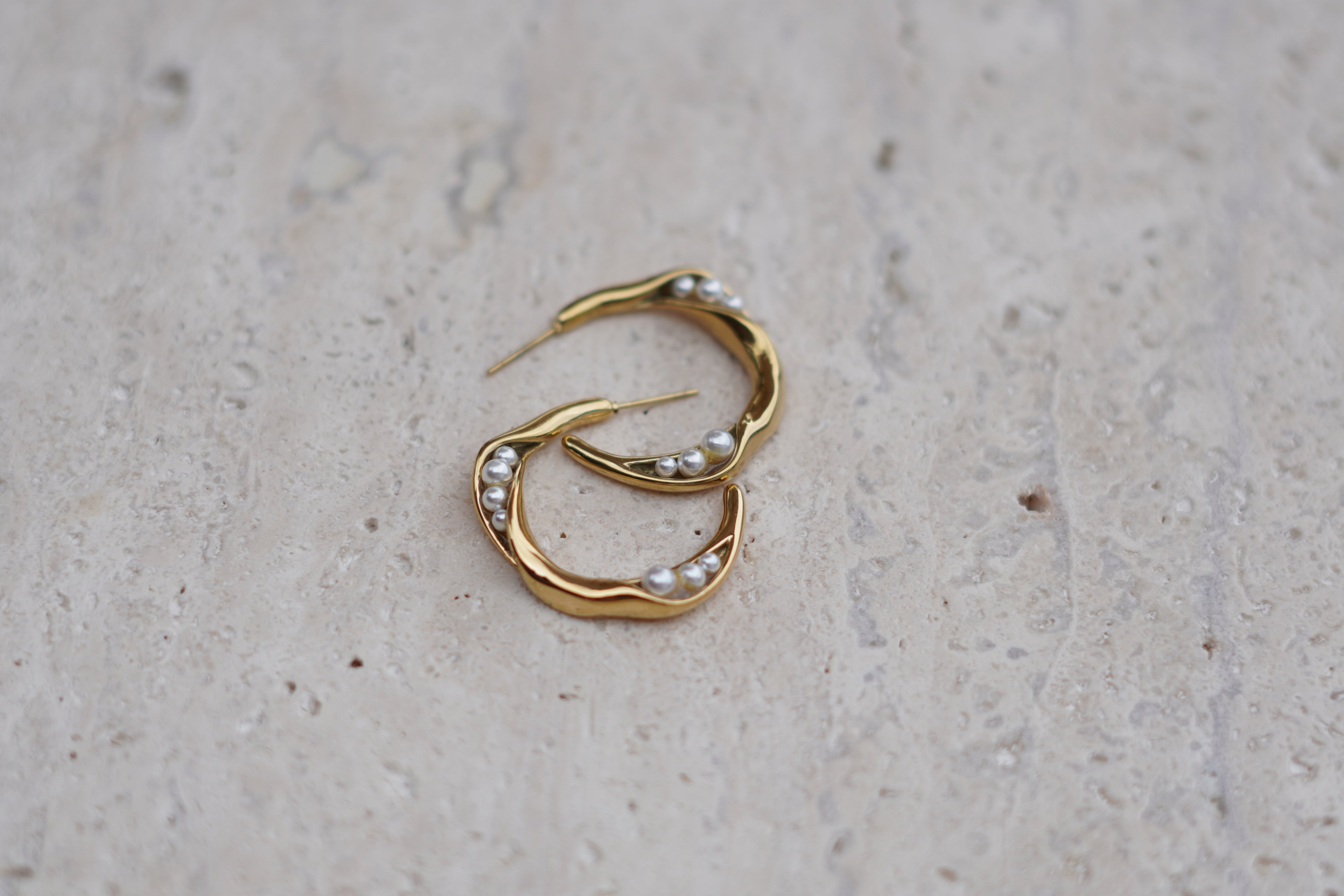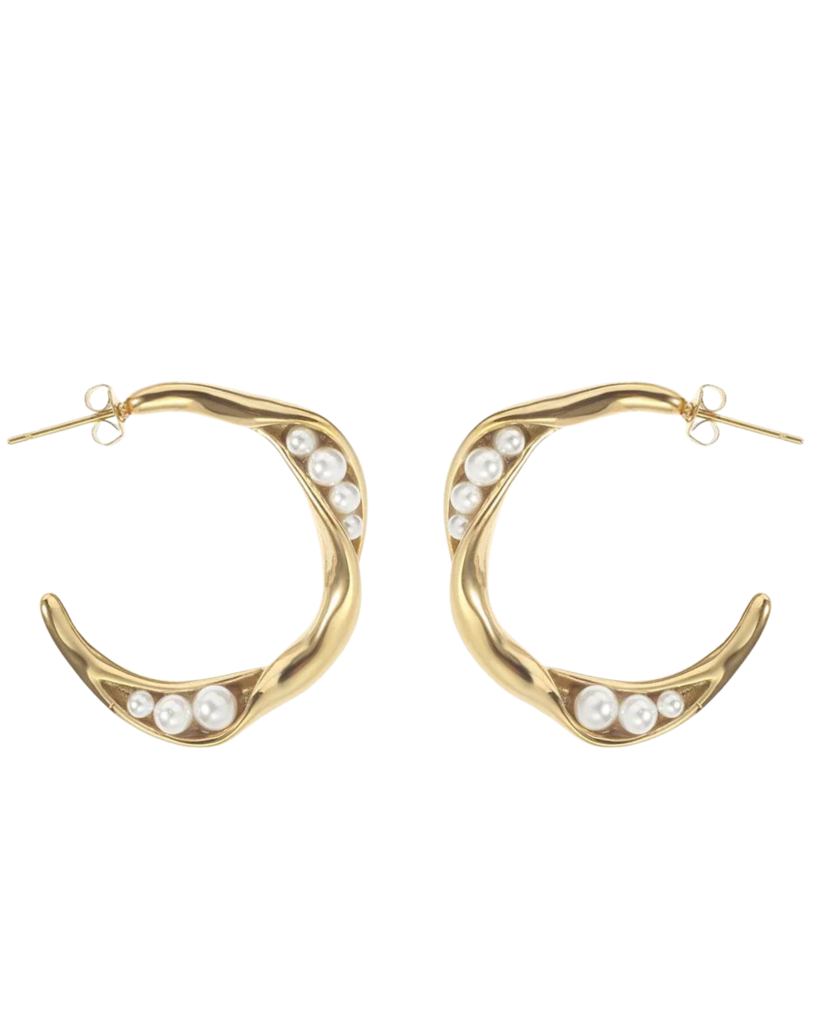 Deze elegante gouden creolen geven jouw look een stijlvolle en moderne twist. Het golvende design is subtiel maar krachtig, en wordt verrijkt met witte parels die zorgen voor een tijdloze, chique uitstraling. Dankzij de bijzondere vorm zijn deze oorbellen net even anders dan klassieke creolen en daardoor een echte eyecatcher.