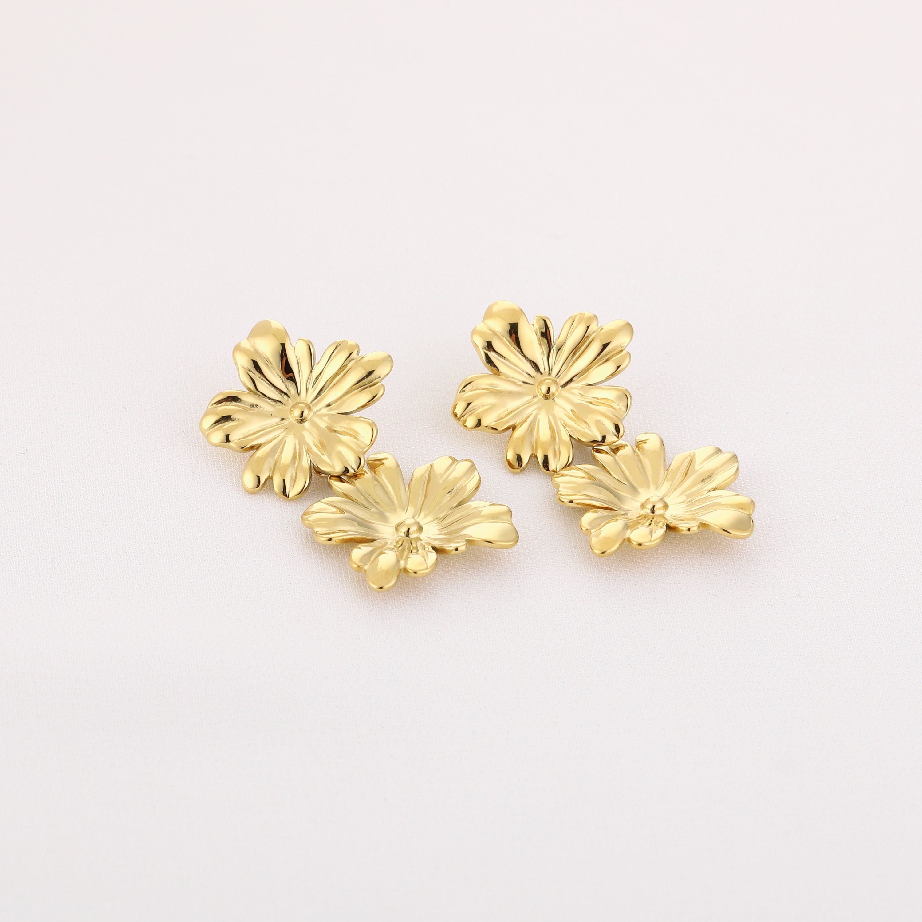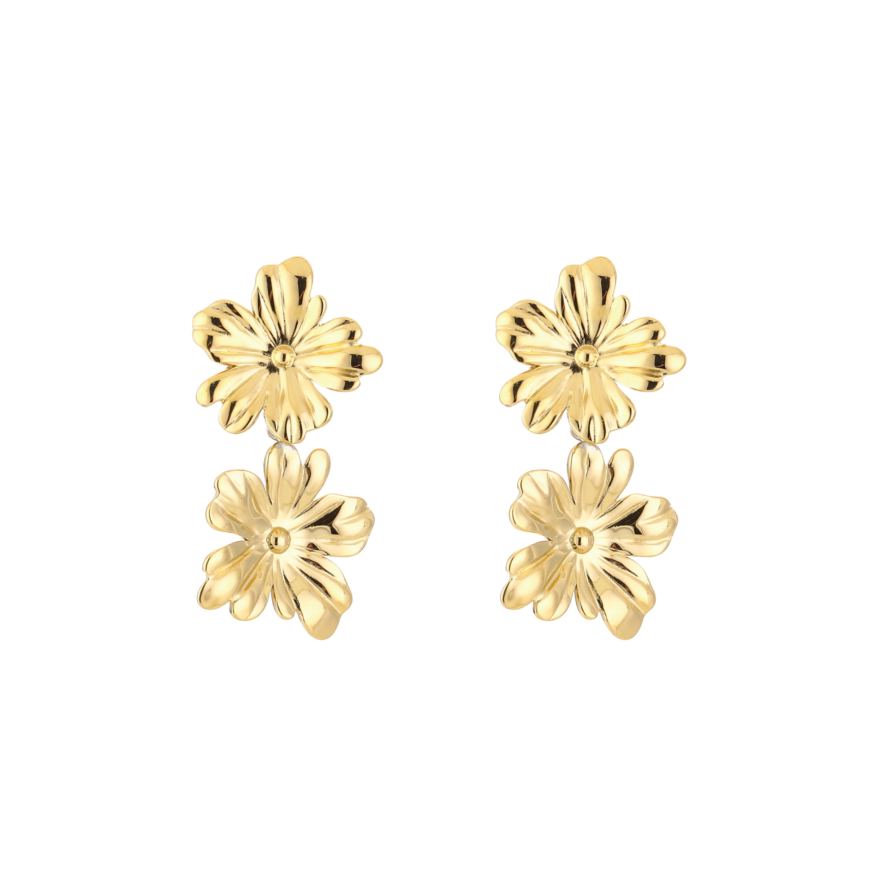 Deze goudkleurige bloemoorbellen zijn een echte eyecatcher. Met twee subtiel glanzende bloemen per oorbel straal je vrouwelijkheid en elegantie uit, zonder dat het té opvallend wordt. Gemaakt van duurzaam stainless steel zijn ze perfect voor dagelijks gebruik én speciale gelegenheden, zoals een bruiloft.