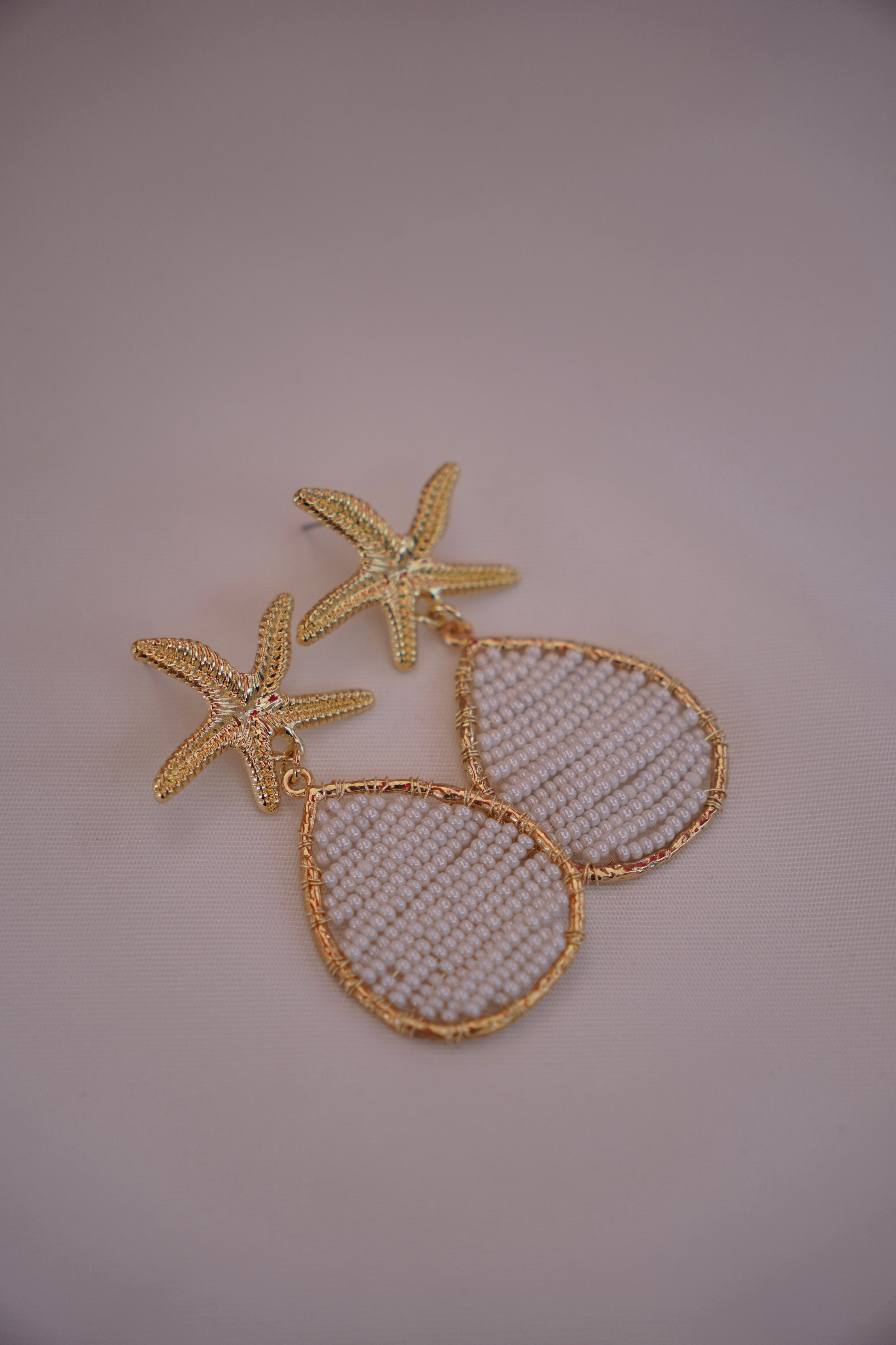 Breng een vleugje zomerse elegantie in je sieradencollectie met deze bijzondere oorbellen. Het ontwerp begint met een schitterende gouden zeester als steker, gevolgd door een opvallende druppelvorm die is afgewerkt met kleine witte kraaltjes in een gouden frame. Gemaakt van brass en volledig nikkelvrij, zijn ze geschikt voor gevoelige oren en comfortabel om de hele dag te dragen.