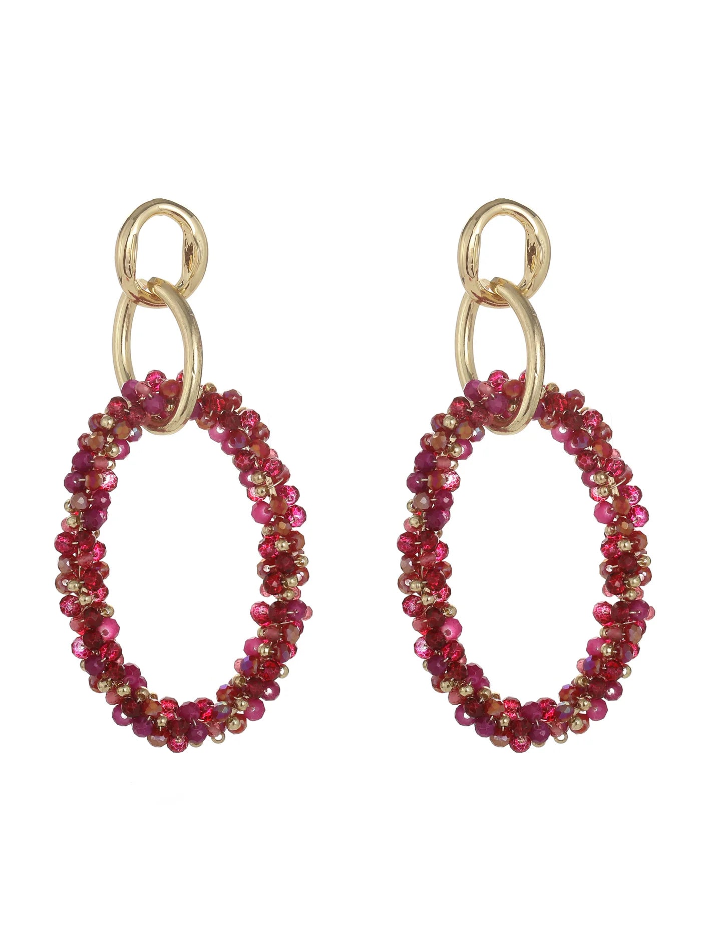 Voeg kleur en elegantie toe aan je look met deze prachtige ovale oorbellen. Het design combineert een goudkleurige basis met een ring van fonkelende dieproze kralen, waardoor de oorbellen een speelse maar verfijnde uitstraling krijgen. De sprankelende kralen vangen subtiel het licht en maken deze oorbellen tot een echte eyecatcher – perfect voor zowel feestelijke gelegenheden als een stijlvolle alledaagse look.