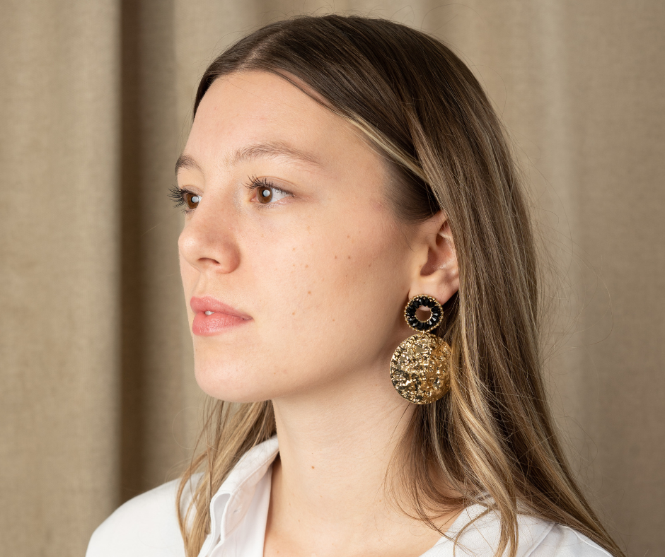 Deze ronde gouden statement oorbellen met structuur hebben een tijdloos design. De combinatie van zwart en goud geeft deze oorbellen een tijdloze elegantie, perfect voor elke gelegenheid. Het bovenste gedeelte van de oorbel is gedetailleerd met een zwarte rand, terwijl het onderste gedeelte bestaat uit een glanzende, goudkleurige ahnger met een gestructureerd ontwerp. De oorbellen zijn ideaal om je look een chique en modieuze twist te geven.