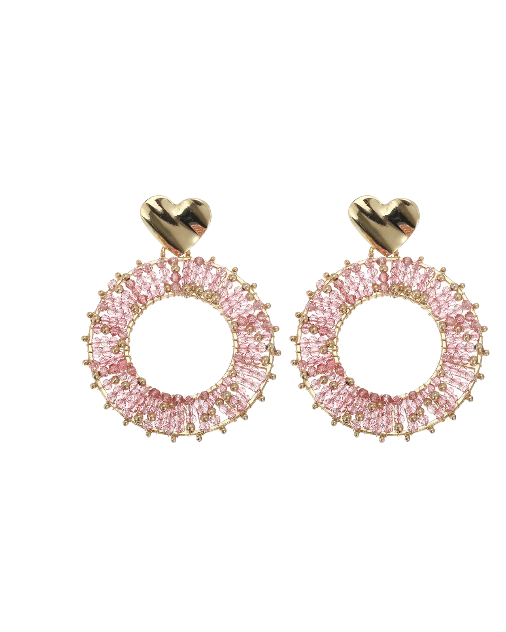 Statement oorbellen met gouden hart en roze kralenring