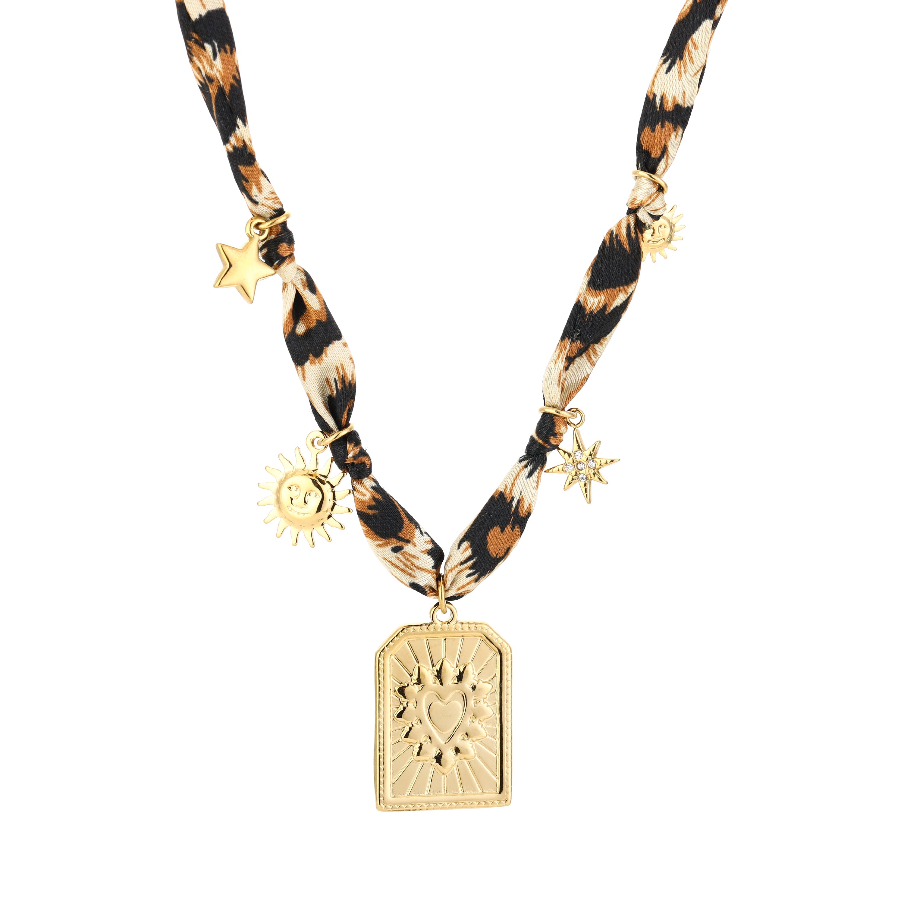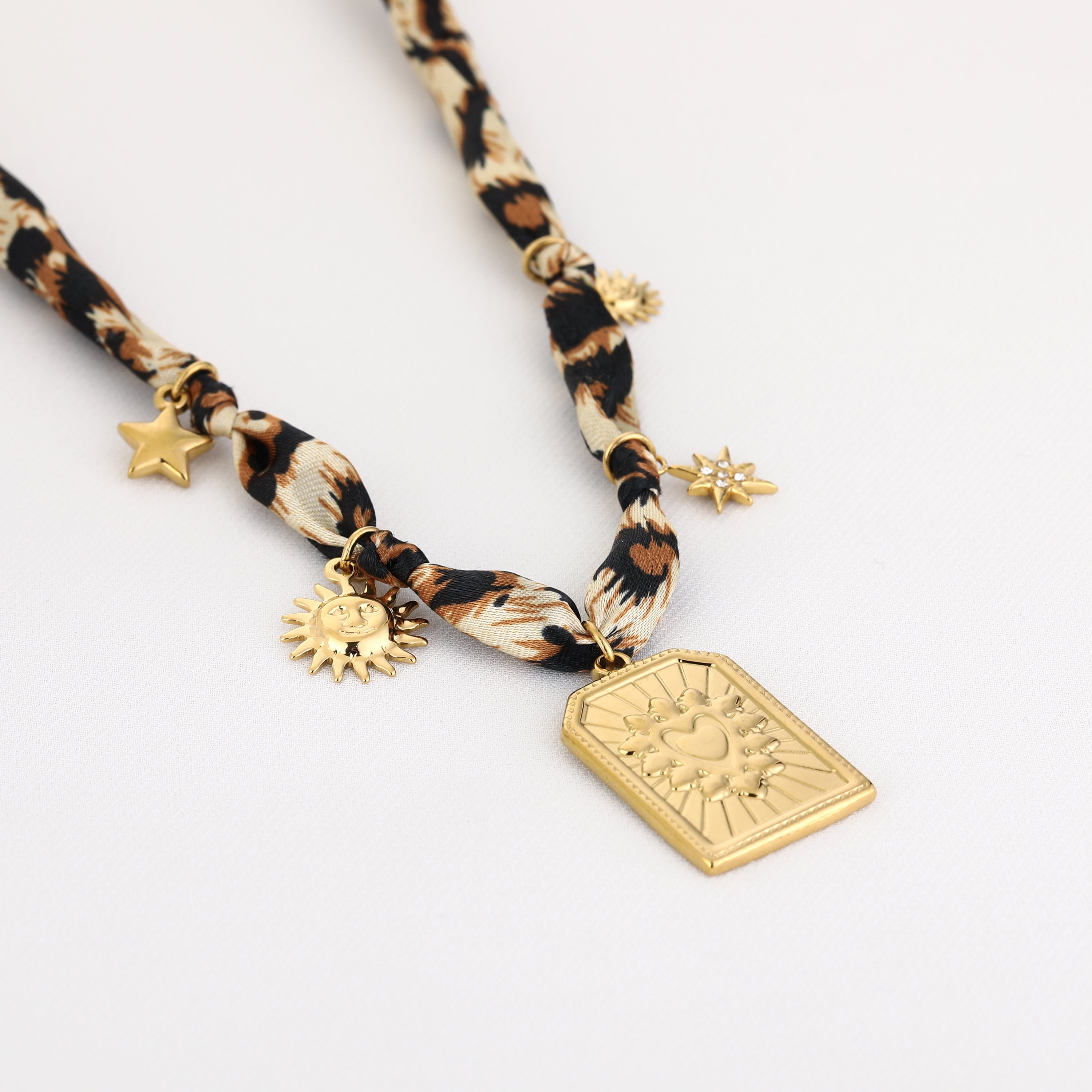 Op zoek naar een statement ketting die je look direct karakter geeft? Deze ketting met panterprint lint en goudkleurige bedels trekt gegarandeerd de aandacht. De combinatie van zachte stof met stevige, glanzende hangers – zoals een zon, ster en hart – zorgt voor een unieke mix van speels en stijlvol. Perfect voor festivaldagen, strandavonden of gewoon als extra touch bij een basic outfit.