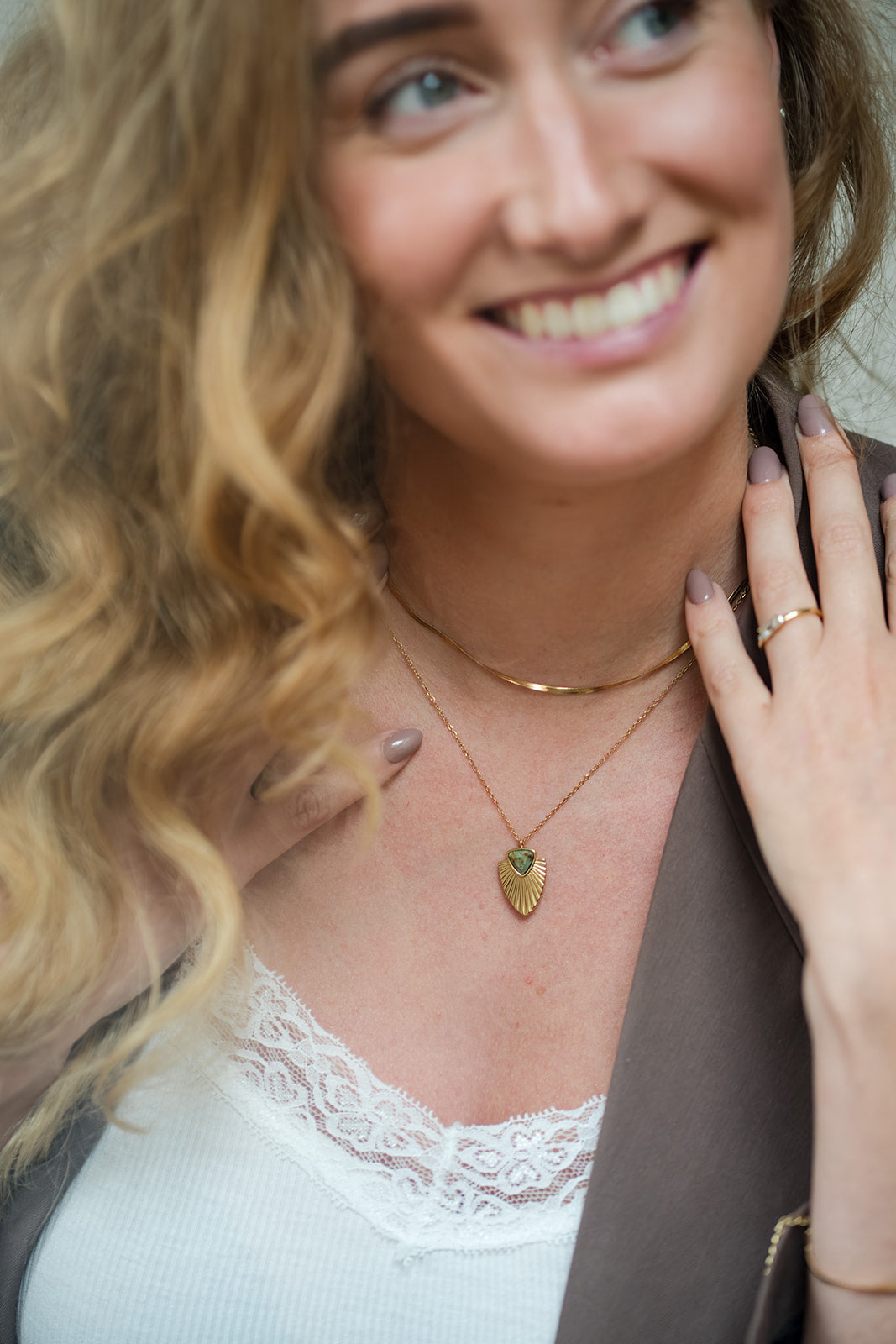 Deze ketting van Keymi heeft een stijlvolle combinatie van gourmet schakels en een platte ketting, afgewerkt met een driekhoekige hanger met een rechte structuur. De ketting is gemaakt van stainless steel en is verguld met 18-karaats goud. Dit betekent dat de ketting niet alleen mooi, maar ook van duurzame kwaliteit is. Het is een hypoallergeen product, wat betekent dat het veilig is voor mensen met allergieën. De ketting heeft een lengte van 40 cm, maar kan met het meegeleverde verlengstukje tot 46 cm worden verlengd.