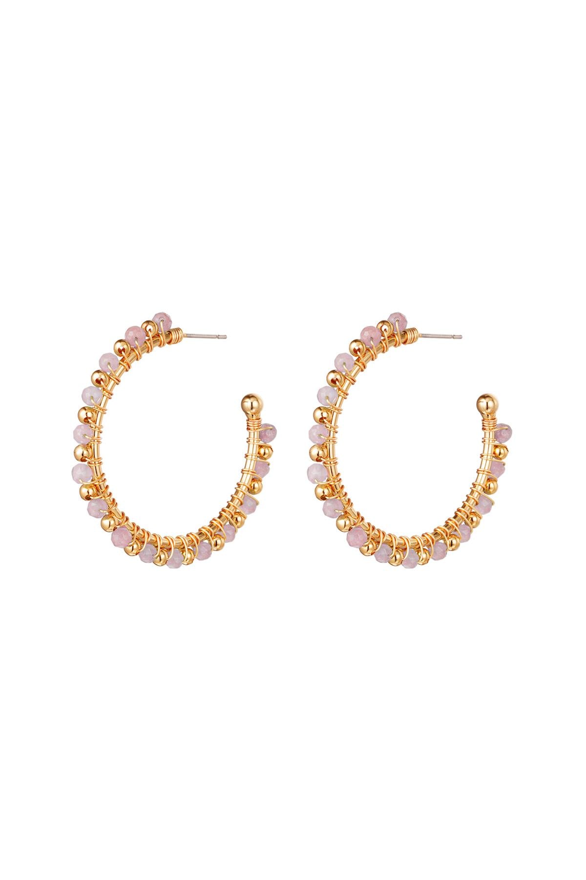 Deze hoepeloorbellen zijn gevuld met kleurrijke roze kraaltjes. De oorbellen zijn gemaakt van koper en hebben een goude kleur, gevuld met roze kralen. De oorbellen zijn leuk om te dragen met een feestje, maar kunnen op een doordeweekse dag worden gedragen. De oorbellen zijn gemaakt van koper, waardoor er meer detail in het sieraad kon worden toegevoegd. Dit betekent wel dat deze oorbellen gevoelig zijn voor verkleuring. Daarom raden wij af om met deze oorbellen te douchen.
