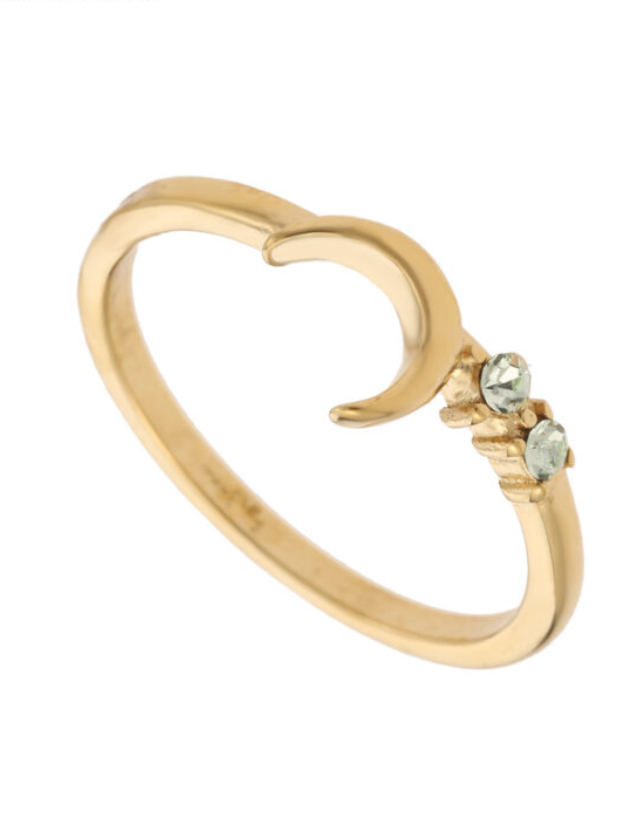 Deze ring heeft een maantje en twee kleine steentjes, die blauwgekleurd zijn. De ring heeft een gladde structuur en is perfect te combineren met een van onze andere ringen. De ring is gemaakt van stainless steel, verguld met een laagje 18K gold plated, waardoor de ring niet verkleurt.