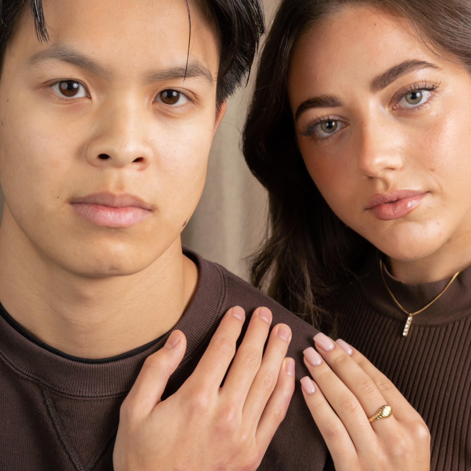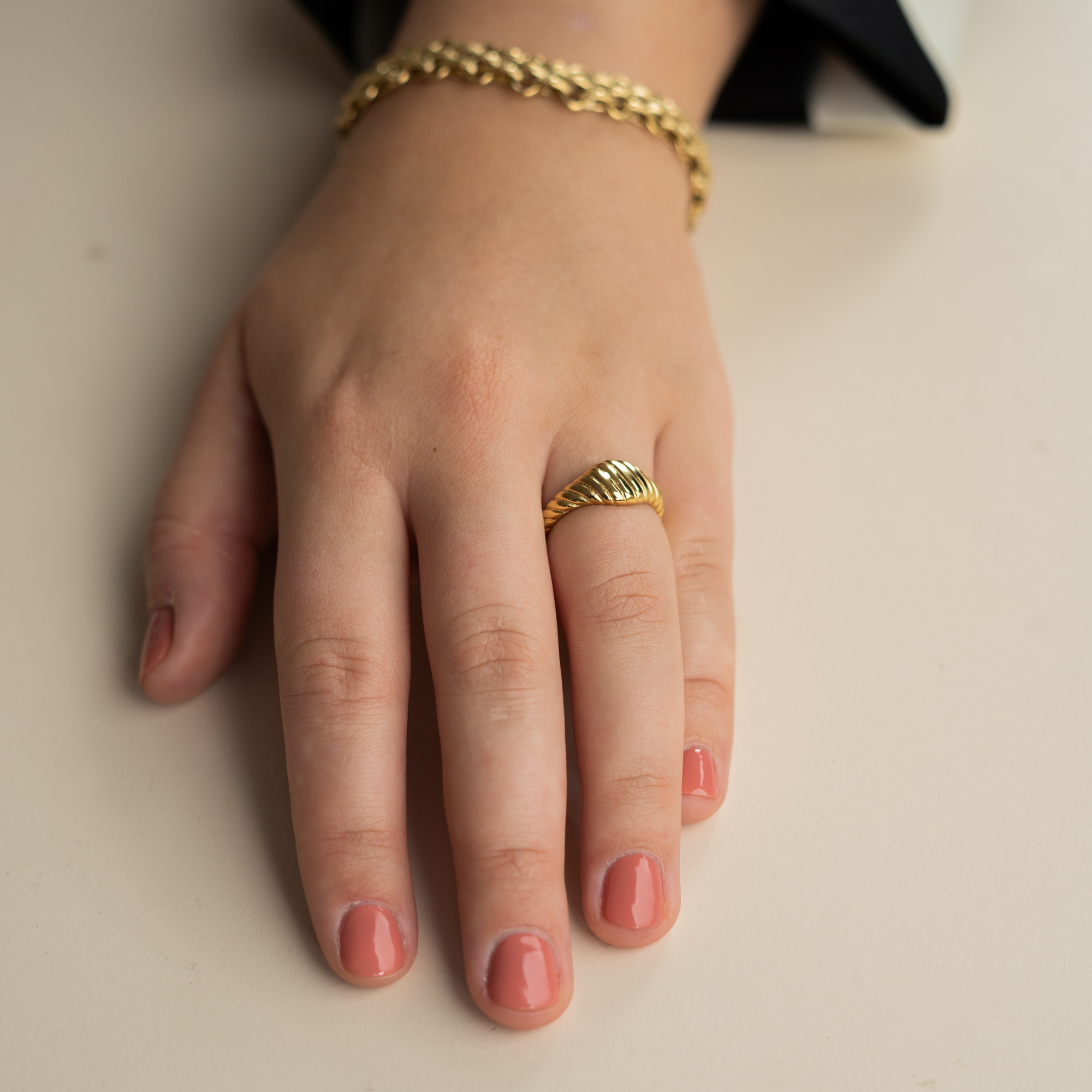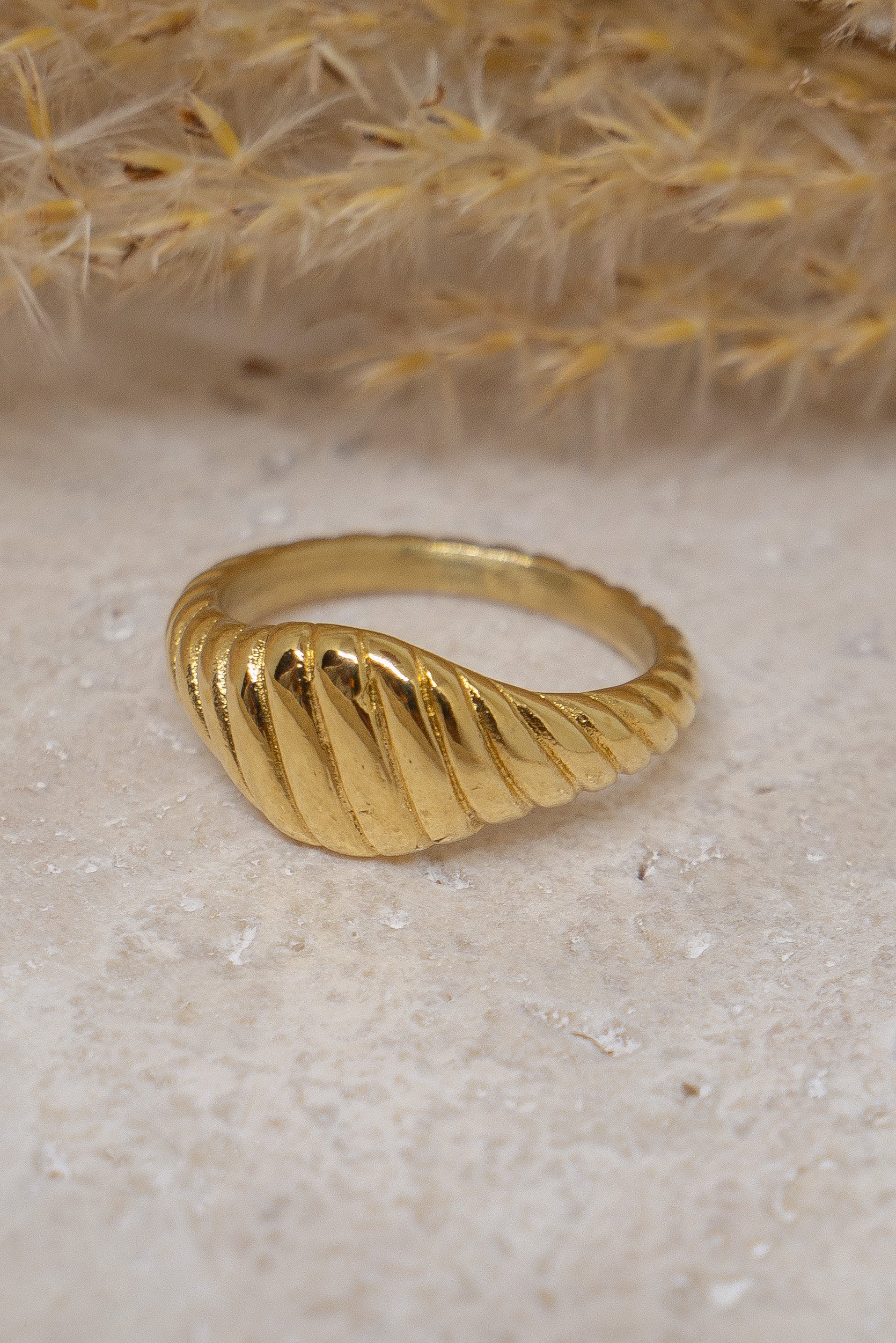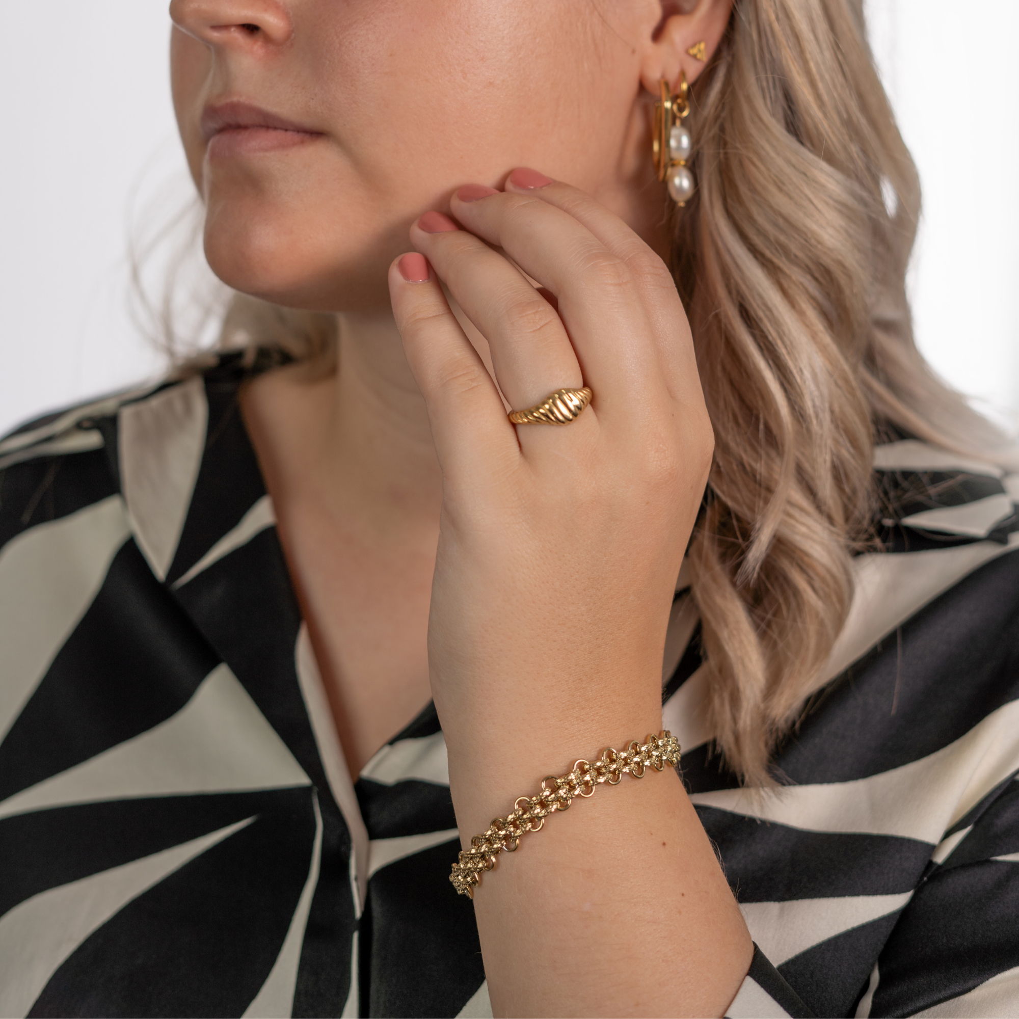 Wij zijn fan van deze chunky croissant ring. De ring is leuk om te combineren met andere minimalistische ringen uit de collectie, maar kan ook als een echt statement item gedragen worden.