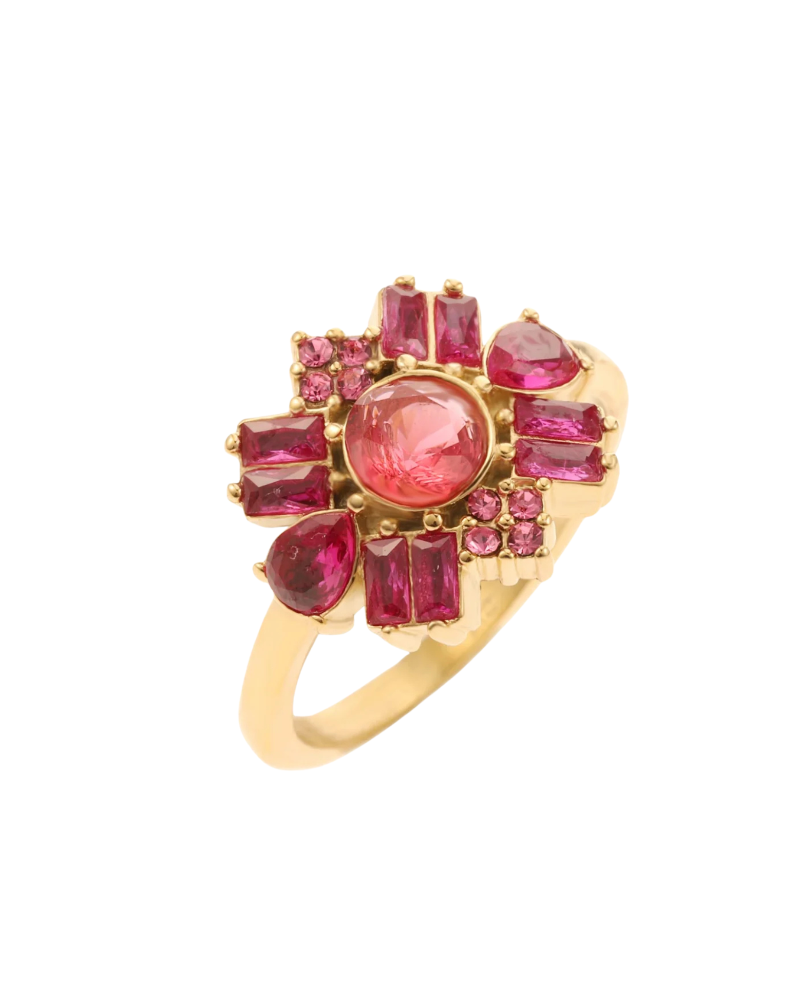 Deze statement ring is een echte eyecatcher en geeft jouw look direct een luxueuze en elegante uitstraling. Het ontwerp bestaat uit een stevige stainless steel ring, verguld met 18-karaats goud, en is rijkelijk versierd met schitterende roze stenen in verschillende vormen en groottes. Het centrale element is een ronde steen die omringd wordt door rechthoekige, druppelvormige en ronde accenten, wat de ring een unieke en speelse uitstraling geeft.