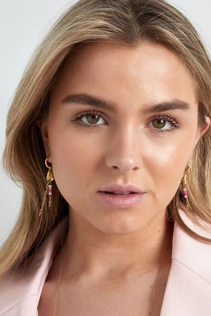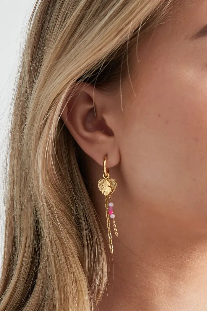Maak je outfit compleet met deze stijlvolle hartvormige gouden oorbellen met kralen en bedels. Het ontwerp combineert een romantisch gouden hart met subtiele roze kraaltjes en kettingen voor een speelse en trendy uitstraling. Deze oorbellen zijn perfect voor een casual outfit of om een feestelijke look een elegante touch te geven.