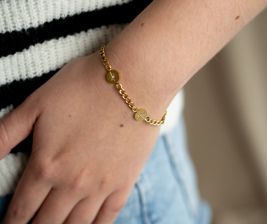 Dit speelse gouden stainless steel armbandje heeft bedeltjes met daarin een gegraveerde ster en een zirkonia steentje.