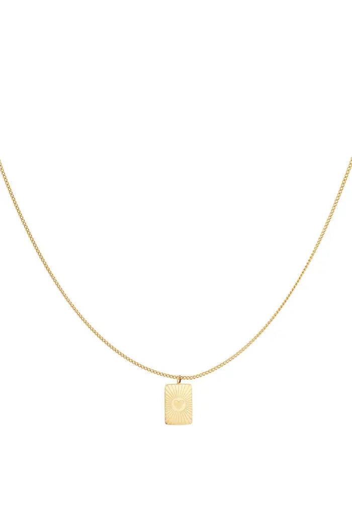 Deze prachtige ketting heeft een subtiele ketting met een rechthoekige bedel met een gegraveerd hartje als hanger. De ketting heeft een lengte van 39cm en een verlengstukje van 5 cm.