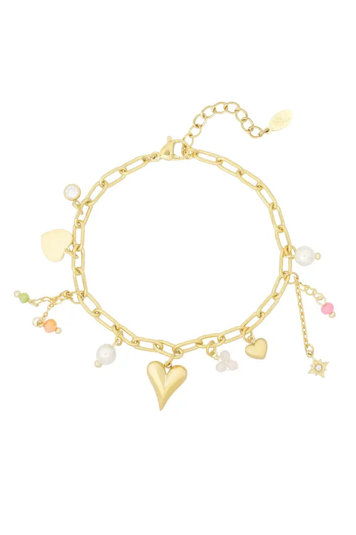 Breng een vleugje elegantie en speelsheid in je look met deze prachtige gouden bedelarmband. Deze armband combineert een verfijnde schakelketting met diverse charmante bedels, waaronder hartjes, parels, en kleurrijke accenten. De armband is gemaakt van hoogwaardig, goudkleurig materiaal dat lang meegaat en perfect past bij elke outfit.