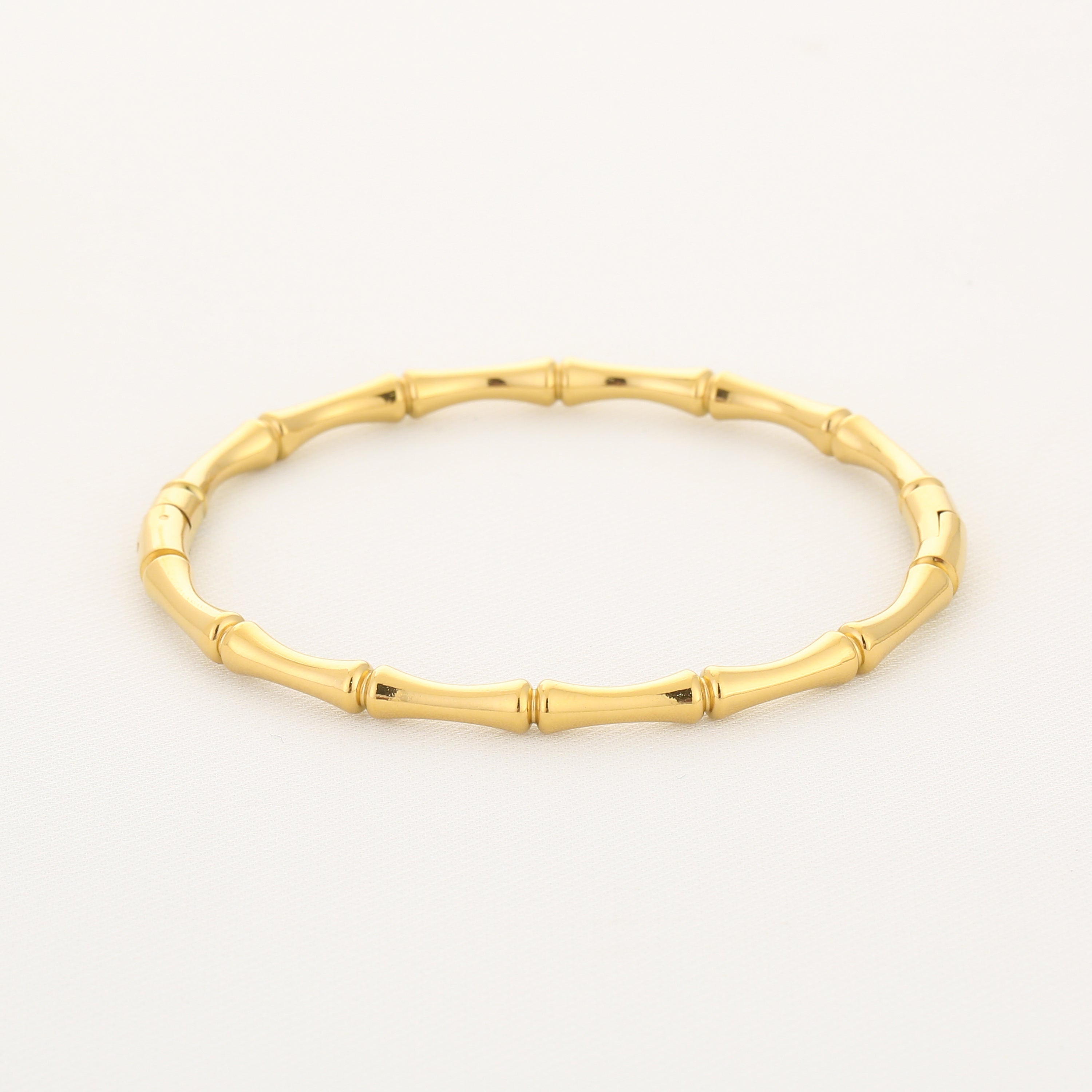 Deze bangle armband met bamboestructuur is een echte statement piece. De goudkleurige afwerking en het strakke, natuurlijke ontwerp maken hem tijdloos en stijlvol. Draag hem solo voor een minimalistische look of combineer met meerdere bangles voor extra impact. Gemaakt van stainless steel: sterk, kleurvast en geschikt voor dagelijks gebruik.