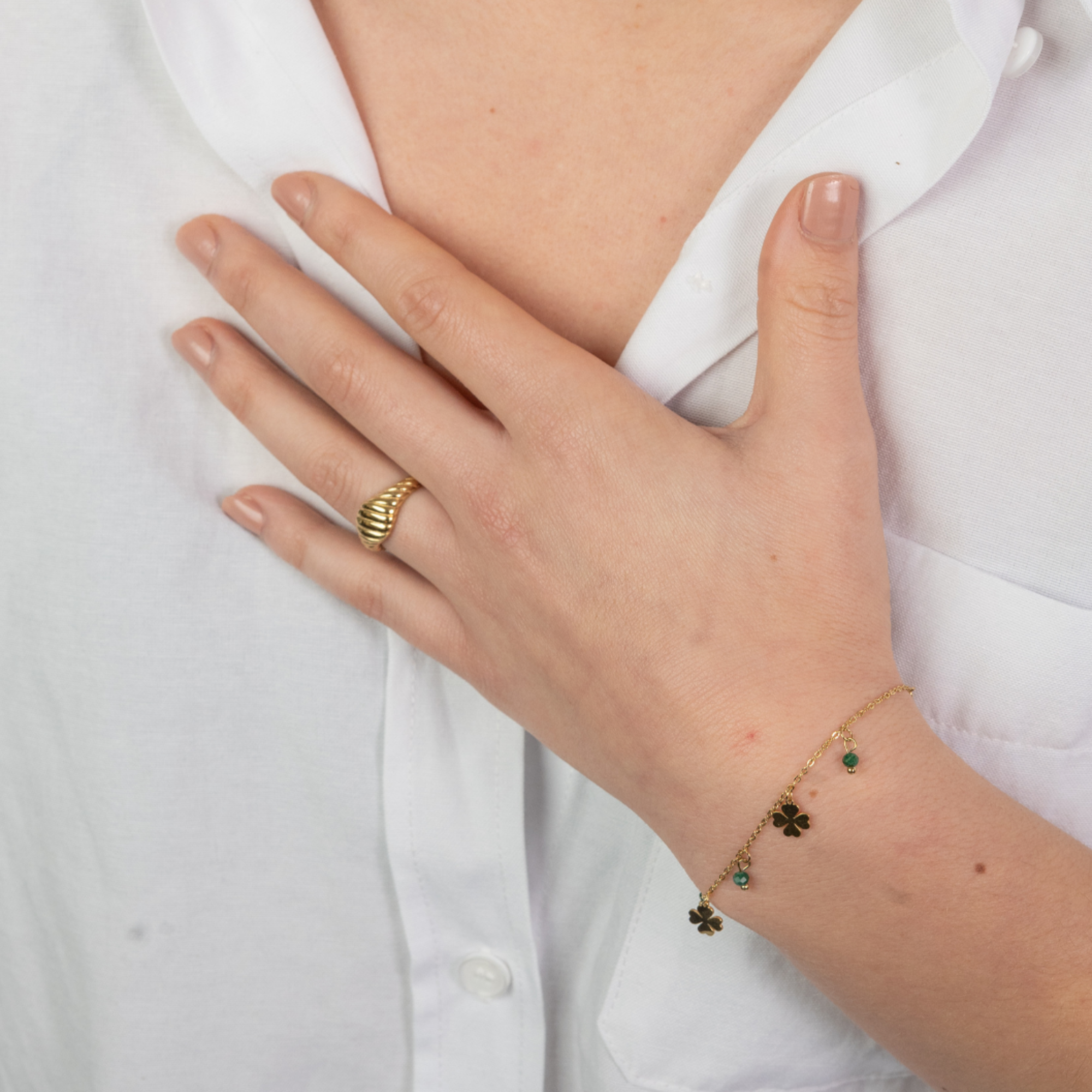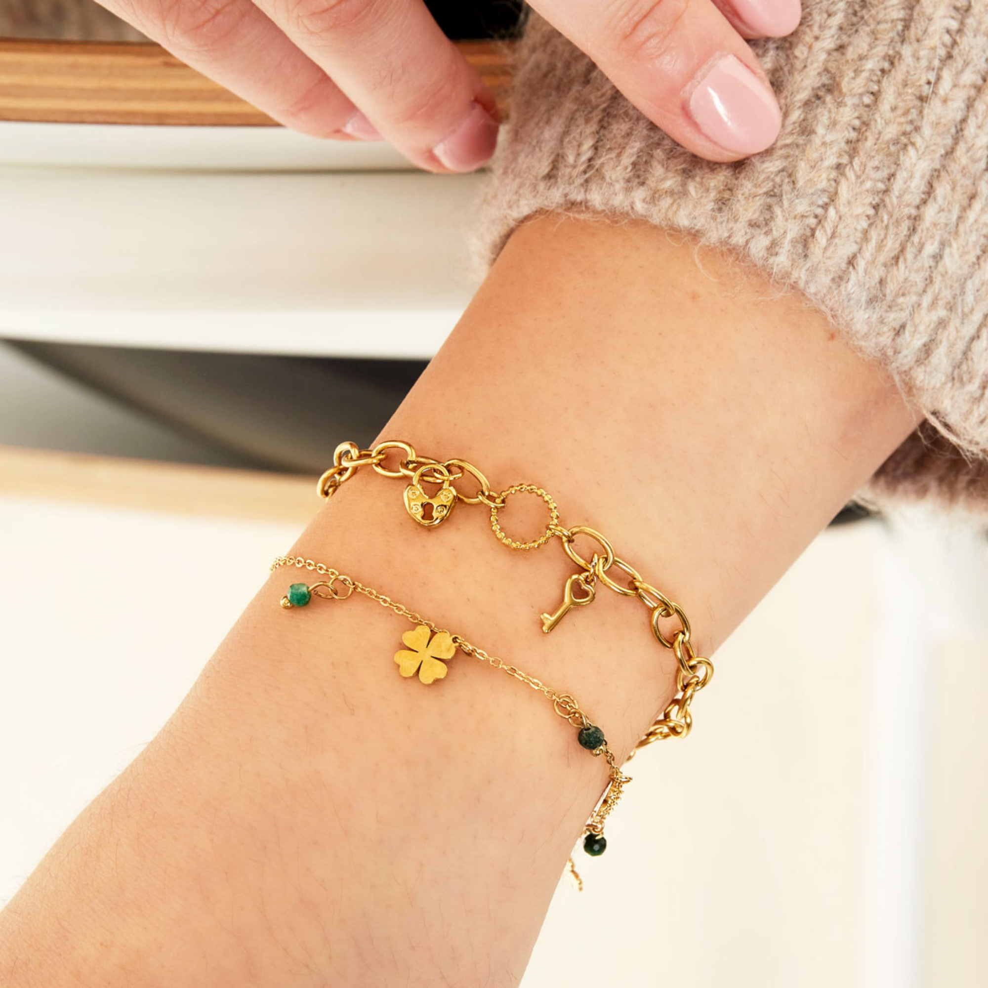 Dit speelse gouden stainless steel armbandje heeft bedeltjes in de vorm van klavertjes vier en groene steentjes. De steentjes zijn gemaakt van het materiaal African jade.