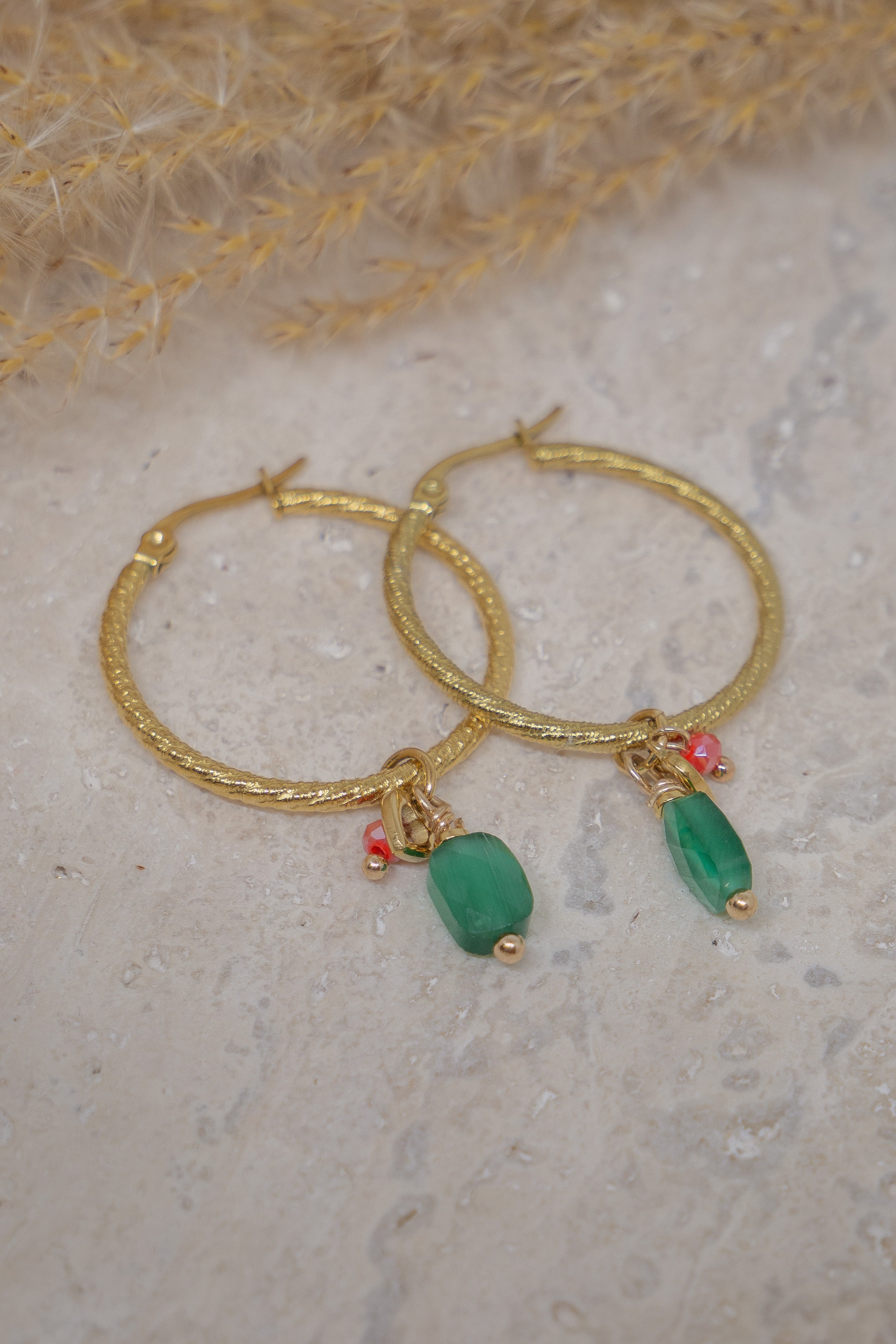 Gouden hoepeloorbellen met groene stenen