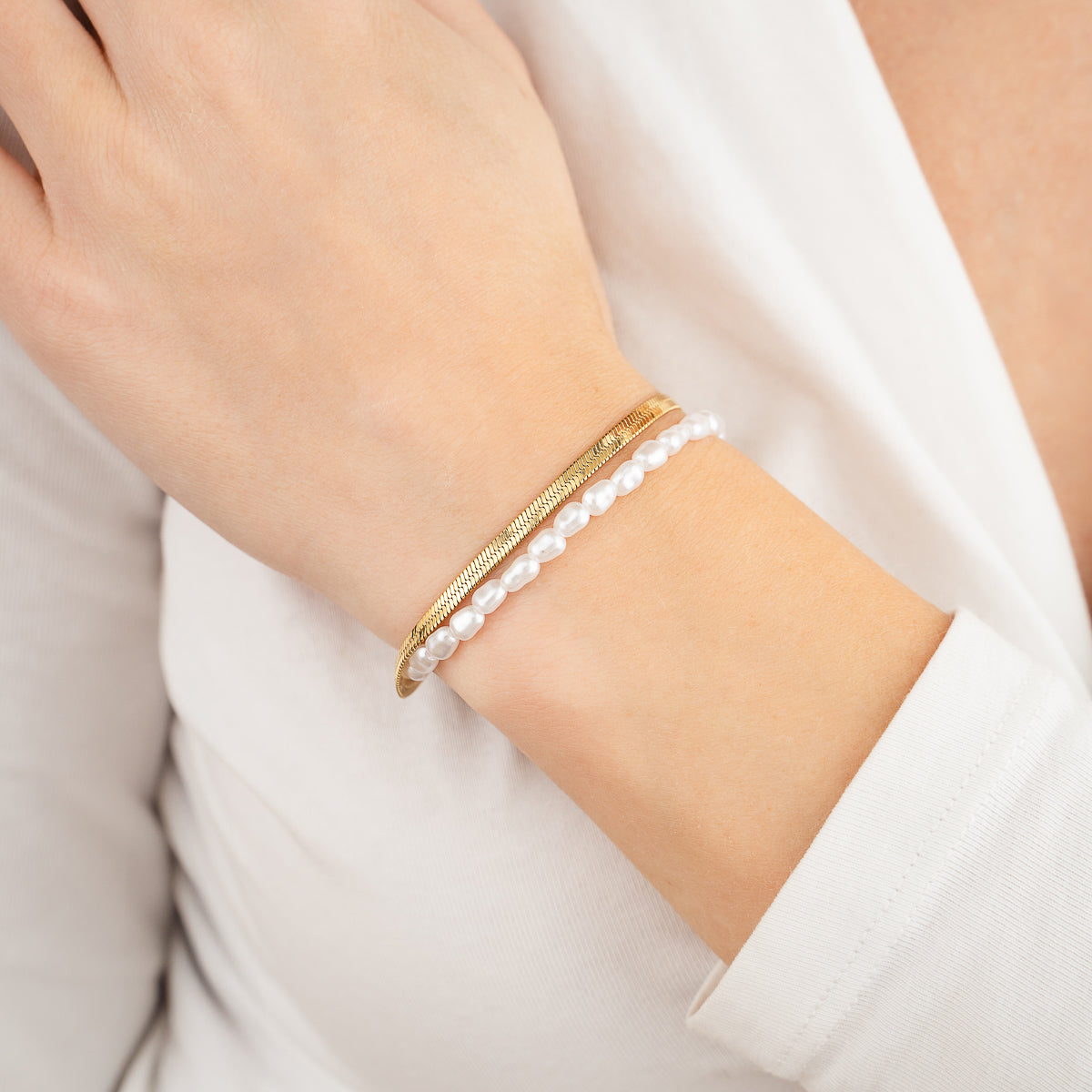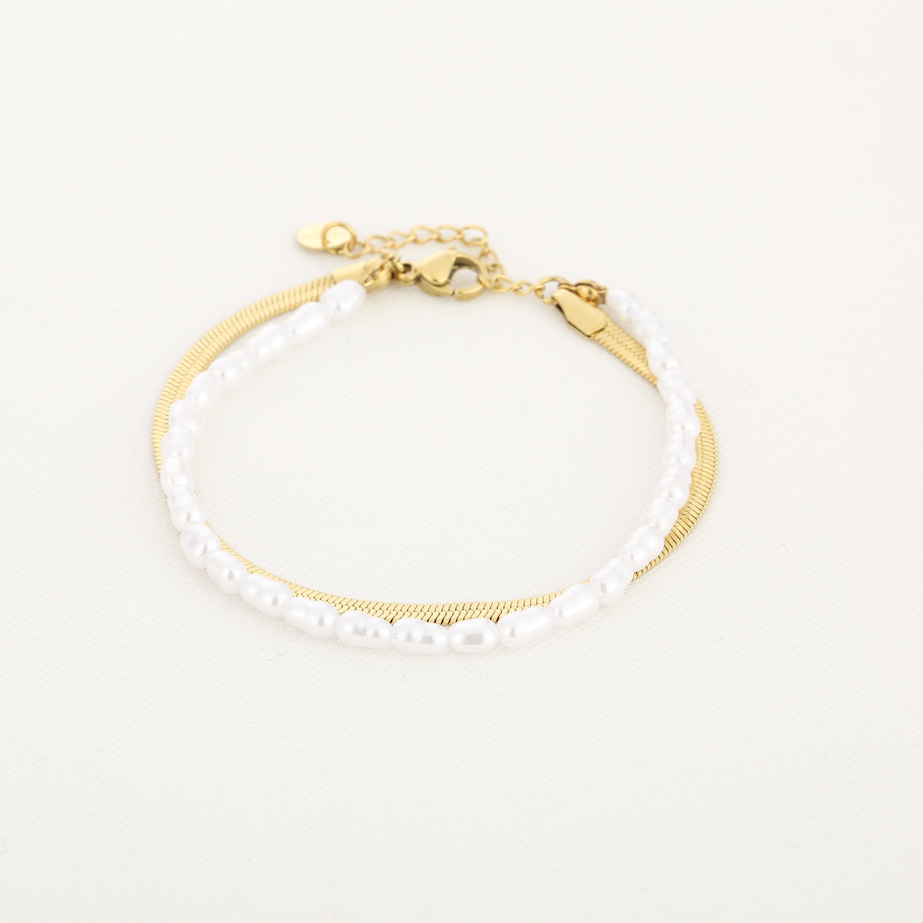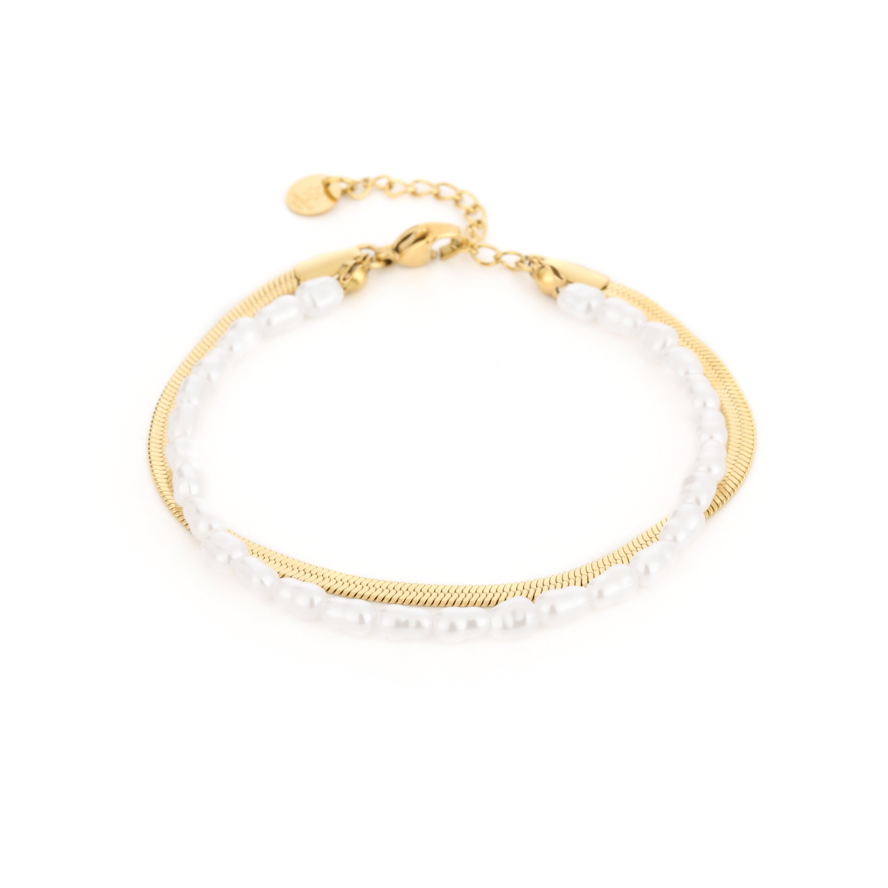 Deze elegante gouden dubbele armband combineert een goudkleurige snakeketting met een rij verfijnde parels, perfect voor een stijlvolle en tijdloze look. Het minimalistische ontwerp maakt deze armband geschikt voor zowel dagelijkse outfits als feestelijke gelegenheden. De armband is verstelbaar voor een perfecte pasvorm en is een prachtige toevoeging aan jouw sieradencollectie.