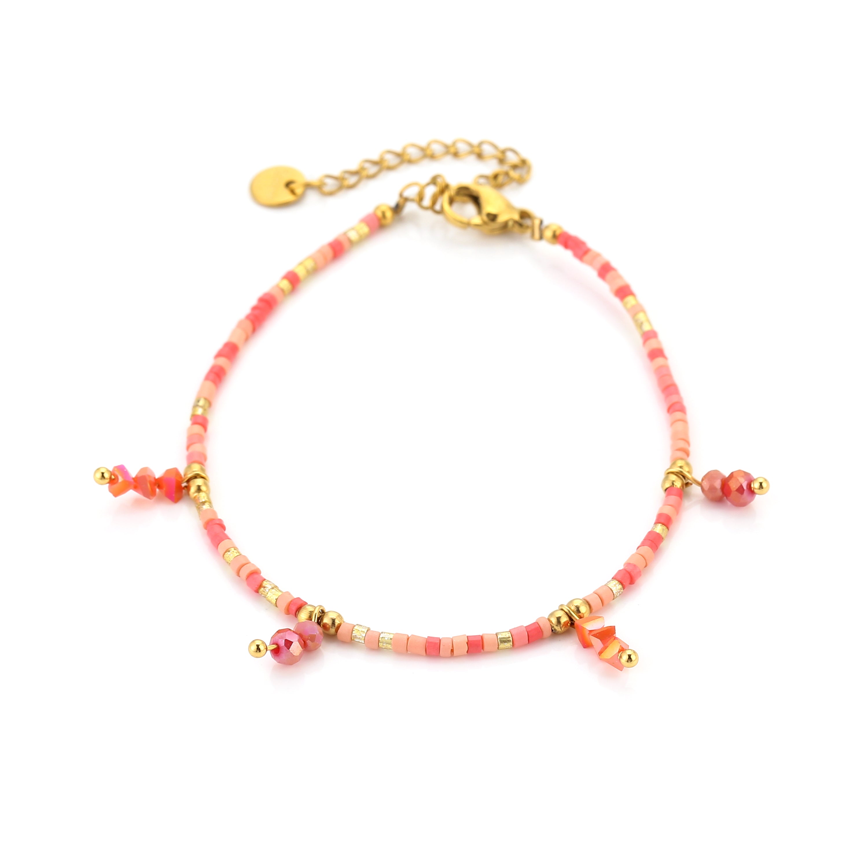 Deze vrolijke armband met oranje en roze tinten straalt zomerse energie uit. De combinatie van kleine kraaltjes, gouden accenten en speelse hangertjes maakt dit armbandje perfect voor een luchtige look. Gemaakt van stainless steel, dus sterk, nikkelvrij en ideaal voor dagelijks gebruik.