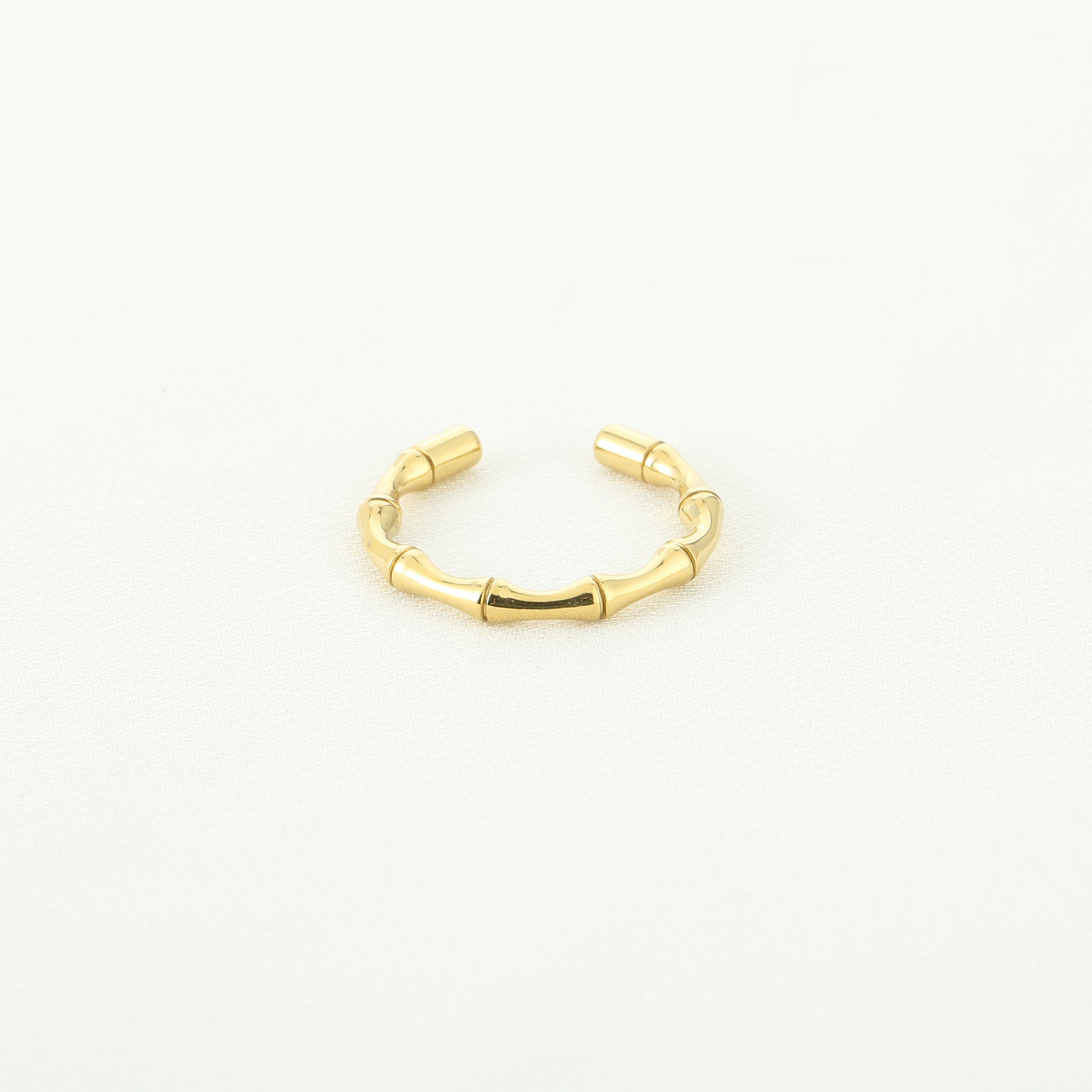 Deze goudkleurige ring met bamboe-look is strak, speels en stijlvol in één. Het ontwerp doet denken aan natuurlijke vormen, maar oogt tegelijk krachtig en modern. De ring is verstelbaar en daardoor geschikt voor elke vinger. Gemaakt van stainless steel, dus duurzaam én kleurvast.