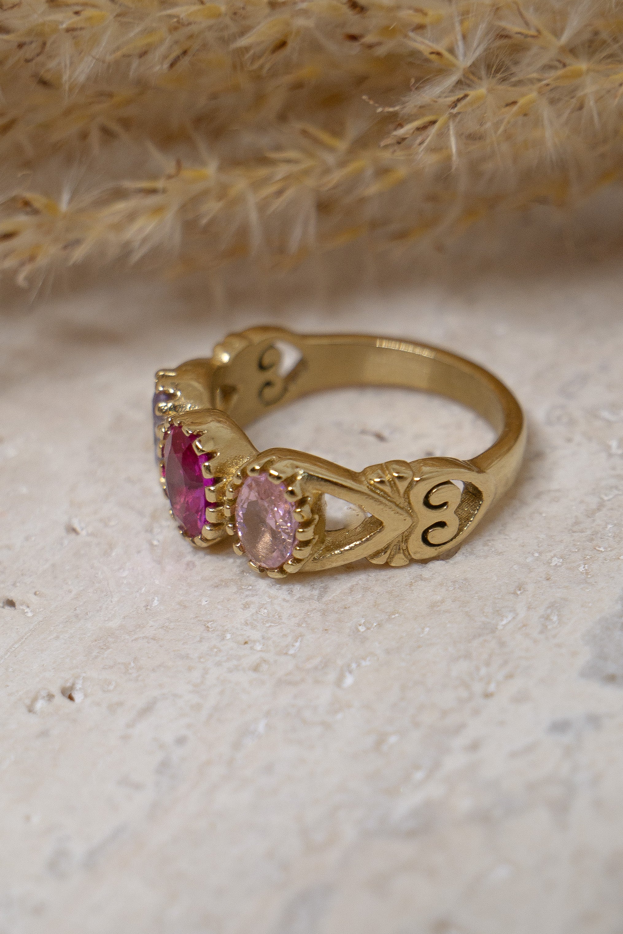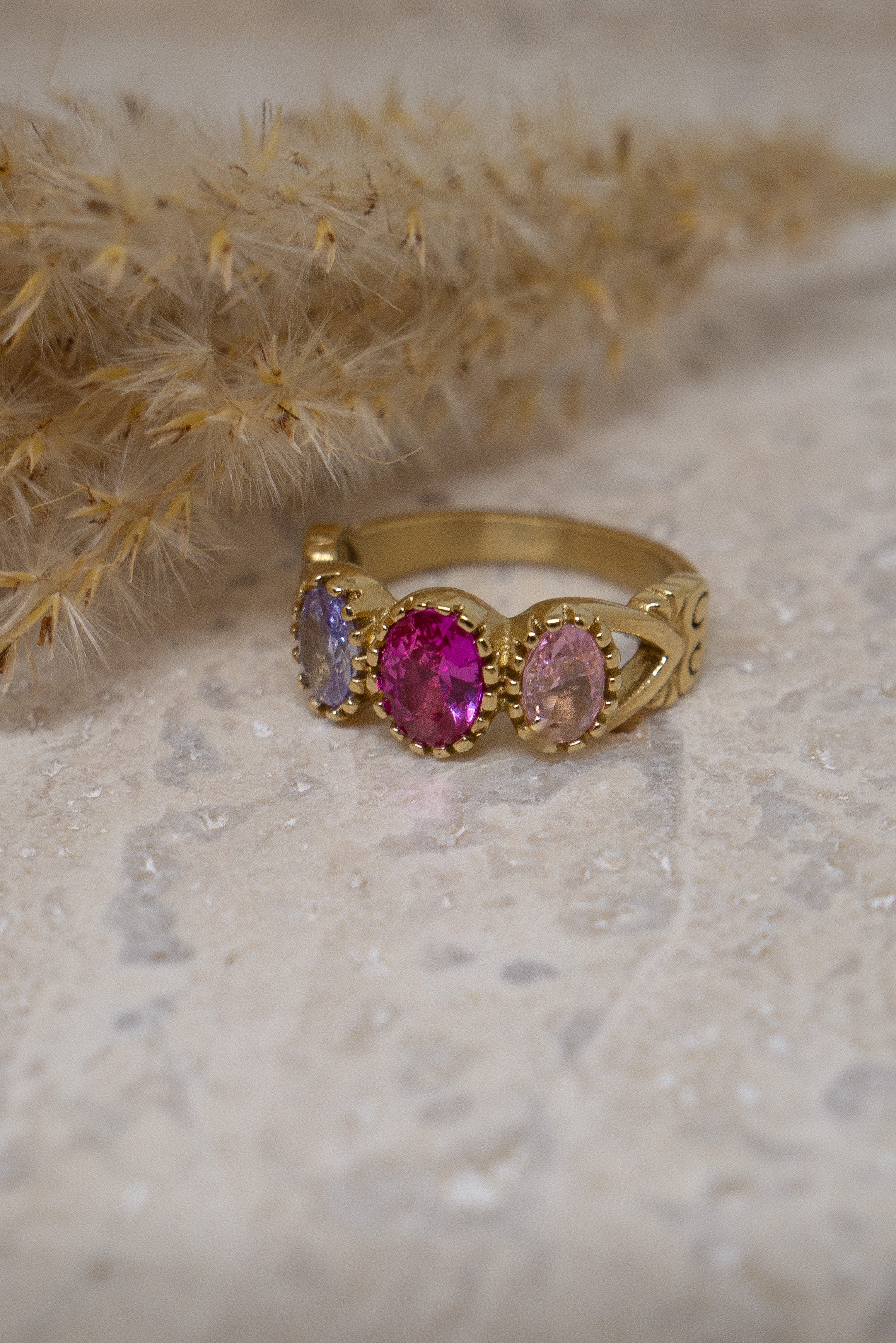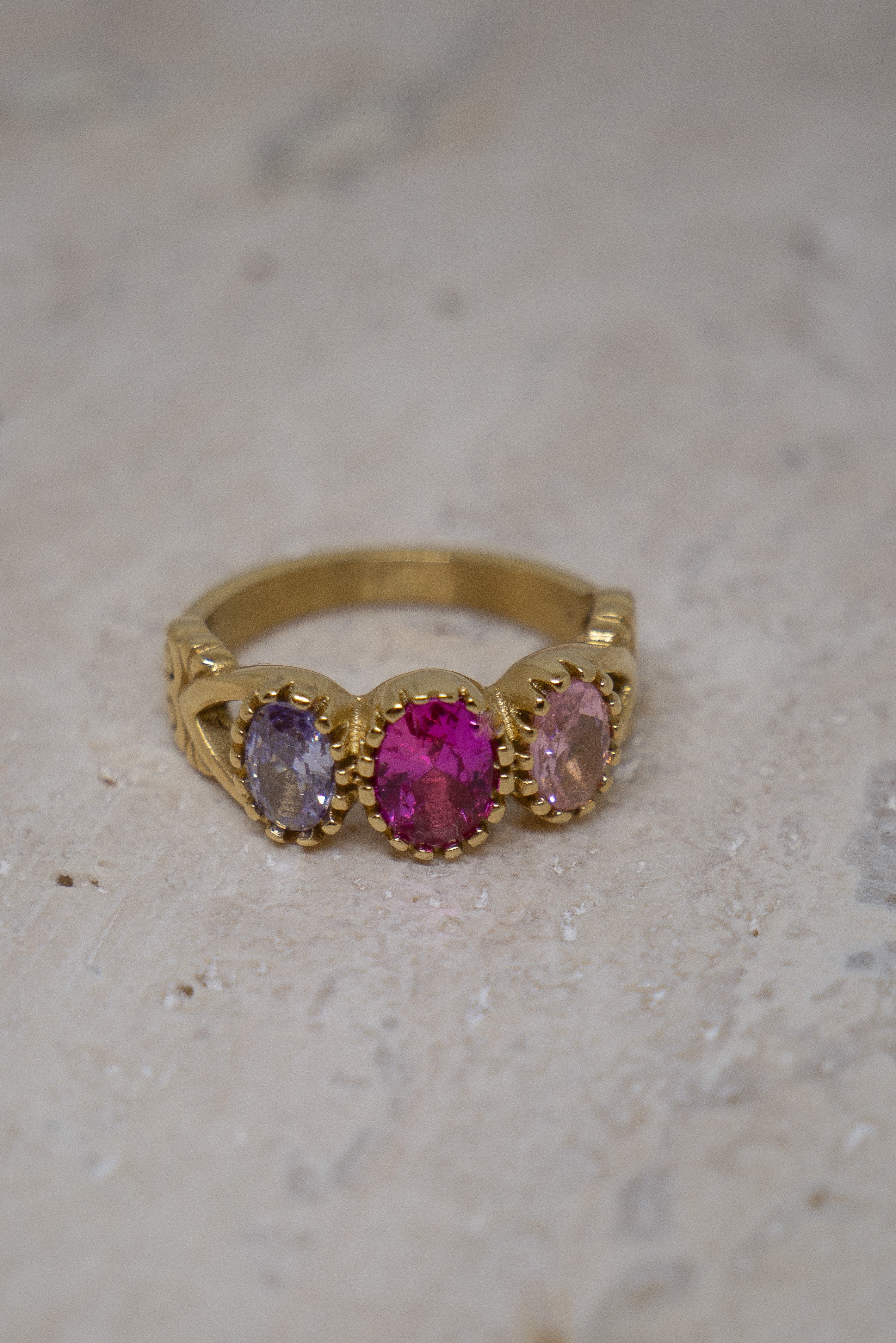 Maak een statement met deze goudkleurige statement ring. Het ontwerp met drie ovale stenen in roze en paarse tinten geeft een luxueuze uitstraling aan elke outfit. De subtiele details langs de ringband voegen een vintage charme toe, waardoor het sieraad perfect is voor zowel dagelijks gebruik als speciale gelegenheden. Deze ring is gemaakt van hoogwaardige materialen voor een duurzame en stijlvolle aanvulling op je sieradencollectie.