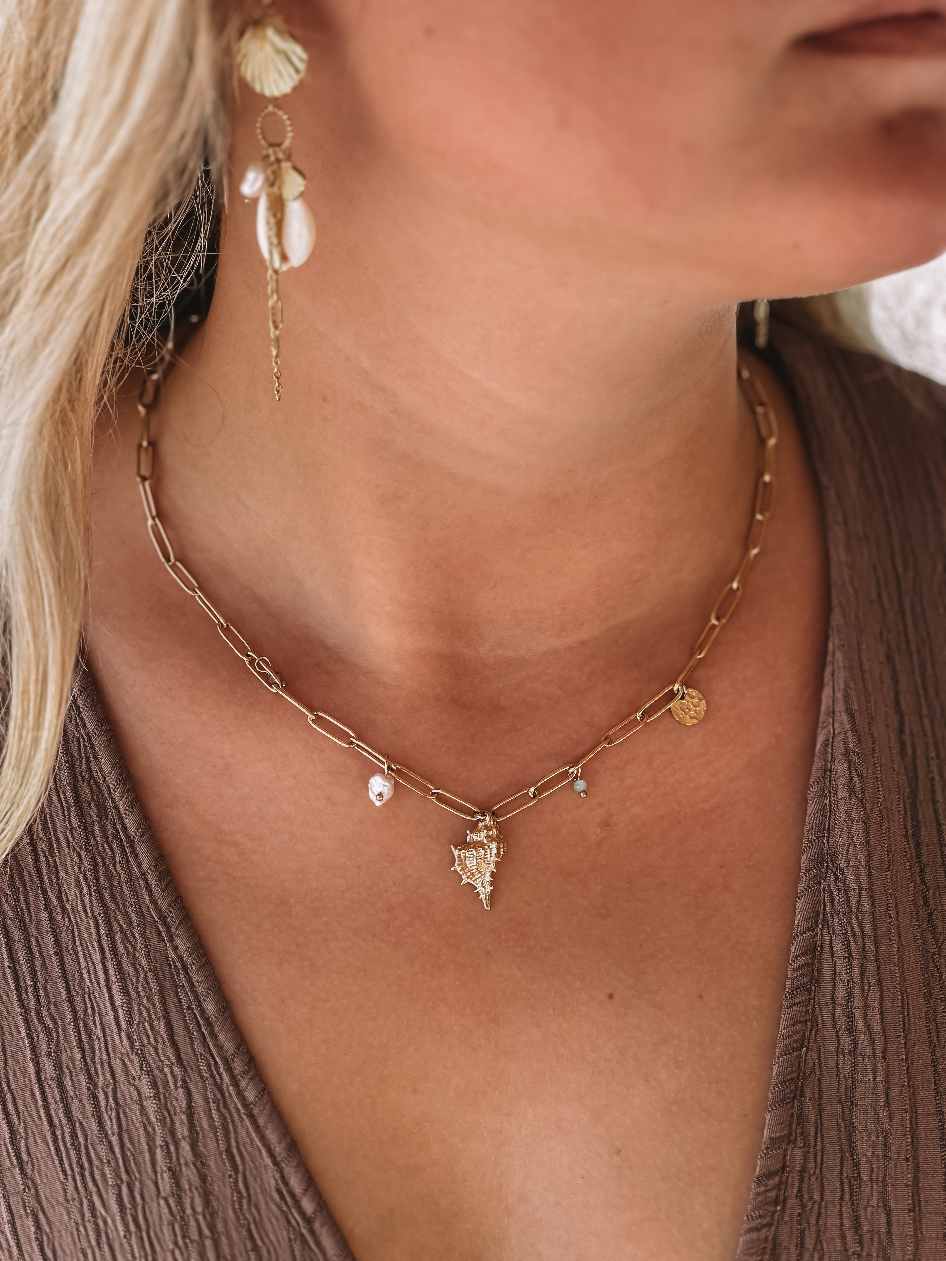 Get ready for the beach! Deze schakelketting, gevuld met bedels, geeft een zomerse touch aan jouw outfit. De ketting, is gemaakt van hoogwaardig stainless steel en komt met één jaar kleurgarantie.