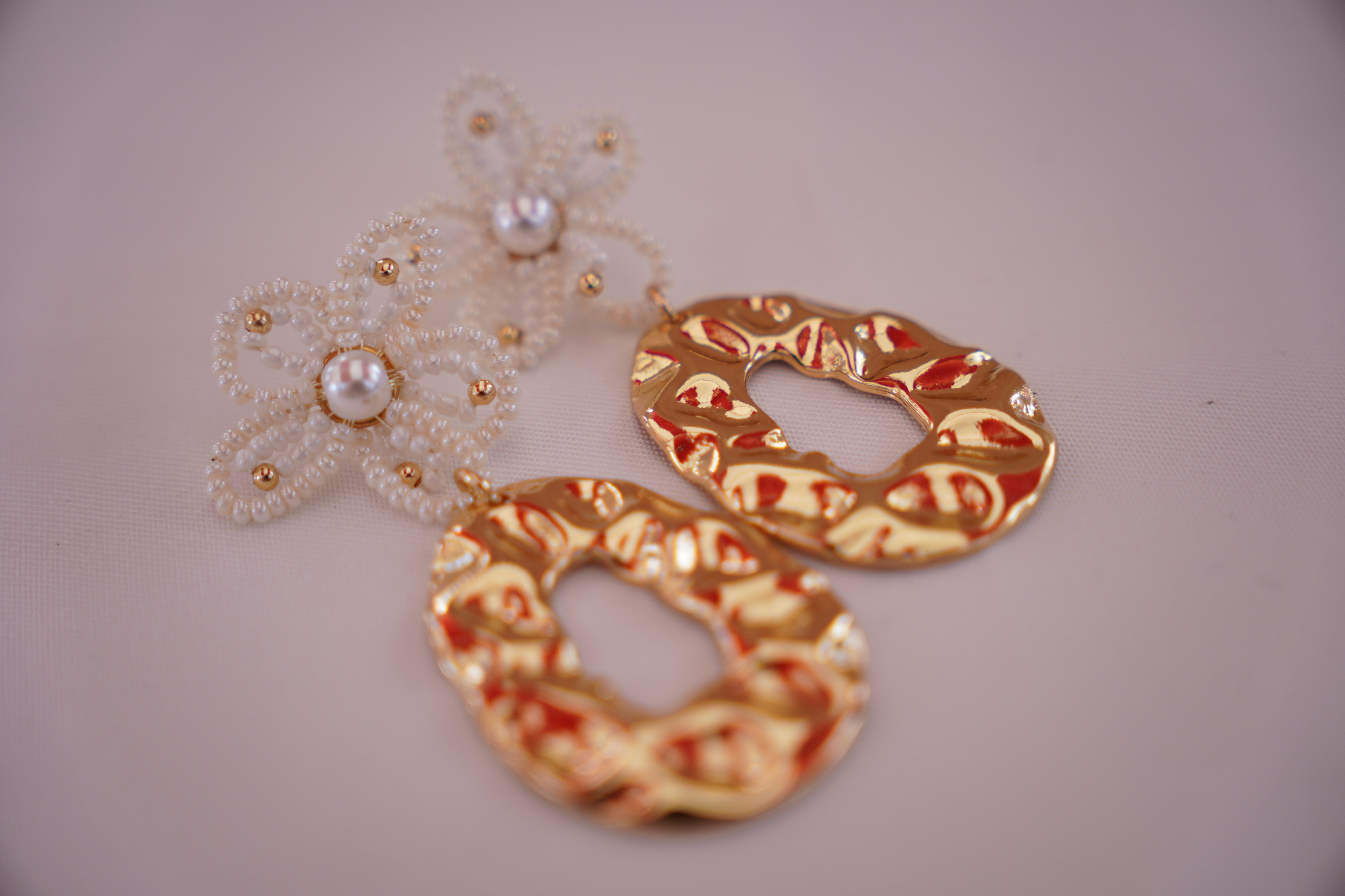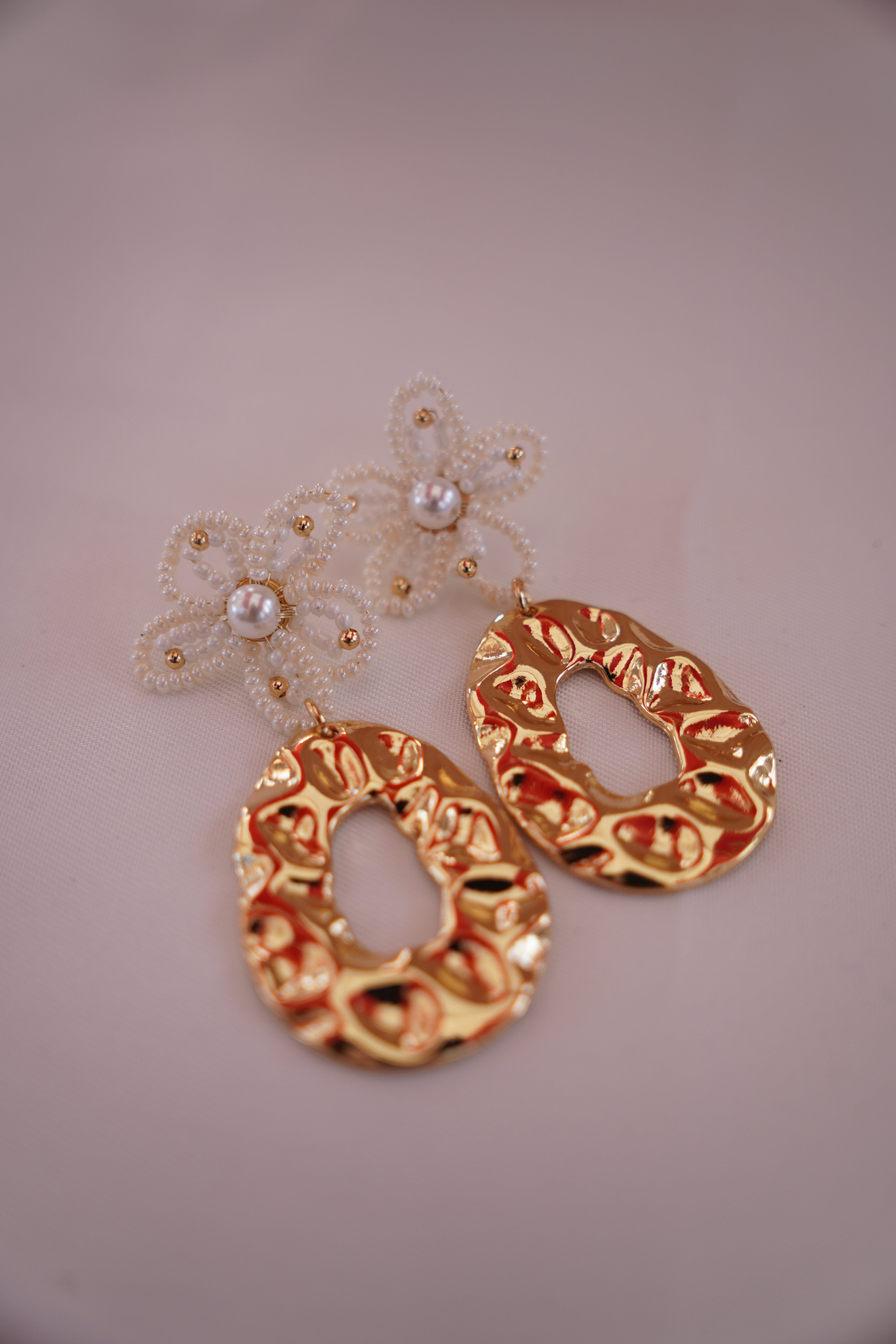 Geef je look een elegante en speelse twist met deze prachtige statement oorbellen. Het ontwerp heeft een verfijnde bloem van witte kraaltjes met een glanzende parel in het midden en een opvallende gouden ovale hanger met een organische structuur. Deze oorbellen trekken direct de aandacht en zijn perfect voor feestelijke gelegenheden of om je dagelijkse outfit net dat beetje extra te geven. De oorbellen zijn gemaakt van brass en zijn volledig nikkelvrij, waardoor ze ook geschikt zijn voor gevoelige oren.